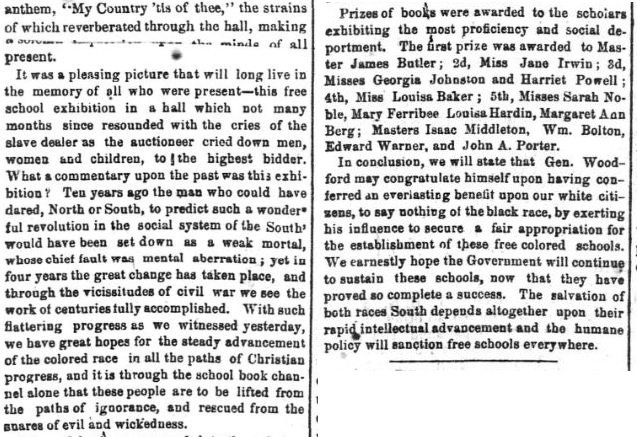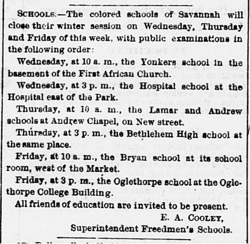 On July 7, 1865, the Savannah Republican recorded a public “open house” offered by the school, attended by the newspaper and dignitaries. The Republican marveled over the property’s transition from a “hall which not many months since resounded with the cries of the slave dealer as the auctioneer cried down men, women and children, to the highest bidder.”