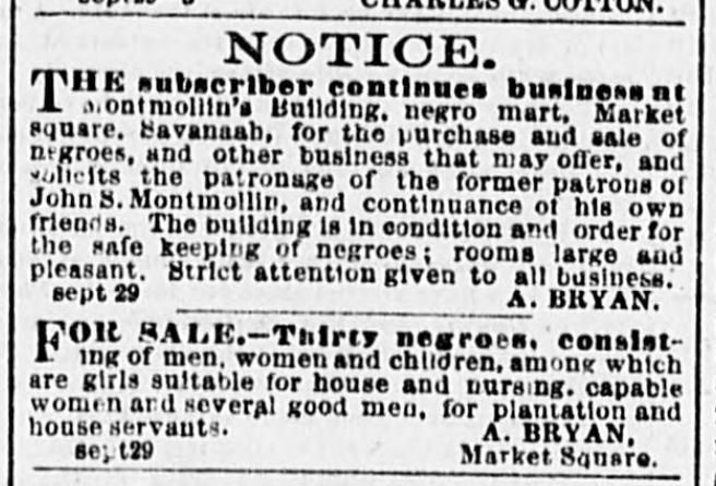Following Montmollin’s death, his business was taken over—and the building leased—by Alexander Bryan, who placed a sign over the doorway reading “A. Bryan’s Negro Mart”. The property was advertised frequently in the Savannah Morning News and listed as Alexander Bryan’s place of business in the 1860 City Directory.