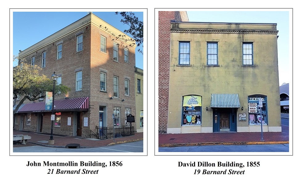 In today’s City Market concourse two buildings adjoin one another… both of which had been built as slave brokerages. On the northern side, facing Bryan and Barnard at 19 Barnard Street, is a structure built for David R. Dillon in 1855. Its southern neighbor, facing St. Julian and Barnard at 21 Barnard, seems to have been completed the following year, in 1856, for John S. Montmollin. The Tax Digest (GHS coll. #5600CT-70) of 1856 valued the tax assessment of Montmollin’s lot at $4500, but by 1857, his “1/8 Lot I & Impro., Decker Ward” was valued at $11,500. Since tax digests reflect the value of the year preceding, this suggests that the building was erected between 1855 and 1856. (Note: “Impro.” means whatever recent “improvements” have been made to the property in question.)