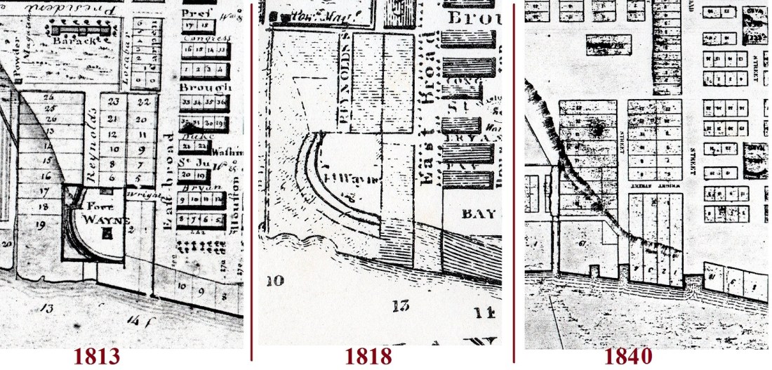 Fort Wayne had effectively ceased to exist by the 1842 Stephens map; Charles Olmstead (1837-1926) recalled from childhood that beyond East Broad Street was “a grassy slope, (site of the Trustees’s Garden in Colonial times) and the remains of an old earth-work erected, I believe, during the War of 1812.” Really, by November of 1839, the Daily Republican rejoiced that what remnants of the old fort still existed were being graded into Reynolds Street.