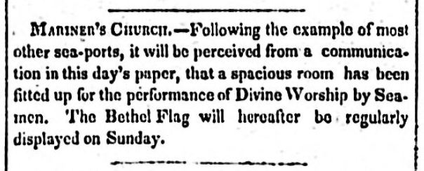 By the early 19th century these mariners’ churches were popping up in seaports up and down the coast, giving traveling captains, their officers and seamen an opportunity to attend worship no matter what port they visited. In 1822 the Lutheran Church of the Ascension on Wright Square was “procured as a Permanent place of Worship for Seamen,” and designated with the Bethel flag, but this permanence ultimately proved less-than; by 1829—as seen in the Georgian article above—a room in one of the riverfront bluff buildings was set aside, “in the upper part of the building occupied by L. Petty, commission merchant as a place of worship,” until a standalone structure could be realized.