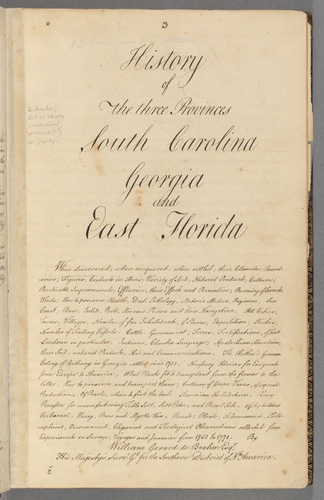 The illustration accompanied DeBrahm’s hand-written manuscript, History of the Three Provinces: South Carolina, Georgia and East Florida, an enormous folio containing his two decades of research between 1751 and 1771, and addressed on its opening page “To the King’s Most Excellent Majesty,” King George III. The seventeen-chapter, three-volume work represented his final report and the end of DeBrahm’s tenure as surveyor. With many of its graphs, figures and annual tables terminating at 1771, the report was current to his departure from the New World. Although there is no precise year of authorship attributed to the manuscript, it is evident the manuscript was brought to completion between 1771 and 1773. For example, within the Appendix of the manuscript (pages 343-44), while discussing the “foregoing seventeen Chapters… of the three Provinces,” DeBrahm referred to 1763 being “just ten years ago,” and one of the tables in the manuscript’s Florida volume is visibly dated to 1773 (page 261). Prudently, Harvard’s own current citation dates the manuscript to simply “after 1771”.