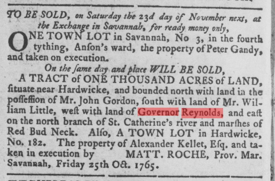 The problem with this argument is that properties were still associated with him years after he left. The lot in question (Lot Z, Anson Ward) was granted in 1755; in a flurry of grants between 1755 and 1756 virtually all of the town’s public lots were granted to individuals (Colonial Records of Georgia, vol. 7, passim) as the Colonial government rejected the necessity for public lots. Whether Reynolds ever built on the lot is unclear; as seen to the left, DeBrahm himself was granted half of the neighboring Lot X in March of 1755, but by his own admission did not build on it before 1760 (History of the Three Provinces, p. 123). I cannot find any record of when Lot Z was relinquished, forfeited or sold to anyone else. Not to call out the 18th century elite, but all three of the Royal Governors were granted numerous Georgia properties during their respective tenures (Reynolds was granted 1.] “an Island containing Thirteen hundred Acres” 2.] “Five hundred Acres of Land in the district of Ogechee,” 3.] “Two Thousand Acres of Land situate between the Great Ogechee and Midway Rivers” in 1755, 4.] “Ten Acres to the Eastward of the Town of Savannah,” 5.] “Two Lotts in Hardwicke” and his aforementioned number 6.] “Lot in Savannah Letter Z” [Colonial Records of Georgia, vol. 7, p.283-84, 294, 312, 329]); when the governors eventually relinquished the properties is not always as clear as when granted. Consider the 1765 Georgia Gazette notice below; even eight years after Reynolds had left Georgia the Ogeechee land grant was still associated with “Governor Reynolds.”