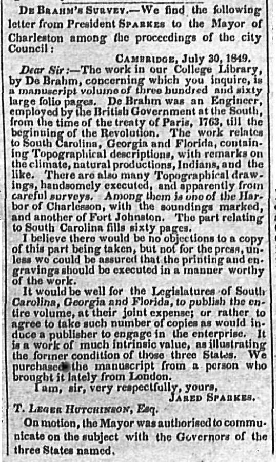Soon after the manuscript was acquired by Harvard in 1848; relevant parties were made aware of its existence. In the summer of 1849 the mayor of Charleston inquired of Harvard President Jared Sparks, whose reply was published in the Savannah Daily Republican on August 11, 1849: