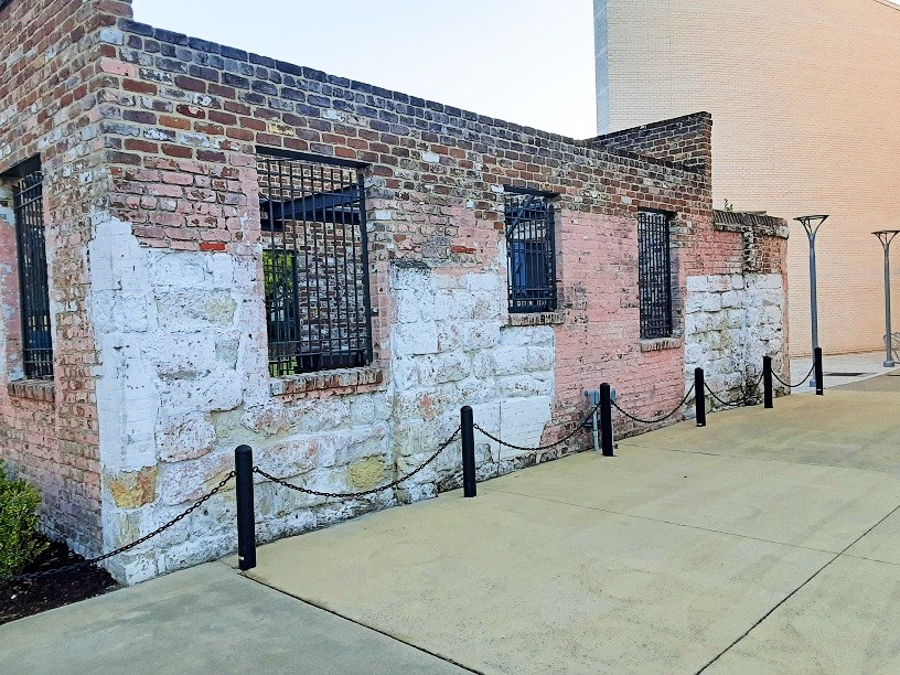 Near the corner of Oglethorpe Avenue and Martin Luther King Blvd, tucked away within the compound of the 2019 Cultural Arts Center, stands a rather odd and mysterious, hollowed-out structure. Its barred windows alone beg questions… was this some old 18th century jail? It looks imposing and stirs the imagination… but honestly, the reality is a bit underwhelming. The bars were added to the windows in 2019(!), and the structure first appears on the 1898 Sanborn Insurance Map, an outbuilding simply described as “shed.” Bluntly, its value today is derived from the fact that it is last remaining vestige of one of the most lamented demolitions of the 20th century… even if this fruit fell rather far from the tree.
