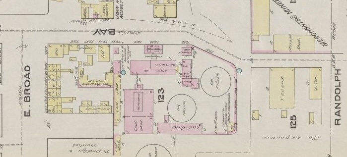 Often referred to thereafter as “Gas House Hill,” the property was next illustrated in the 1871 Birdseye View of Savannah. By this time it had clearly delineated outer walls. In short, not only do the walls we see today not date back to Ft. Wayne, but they don’t even date to the earliest iteration of the Gas Works compound.