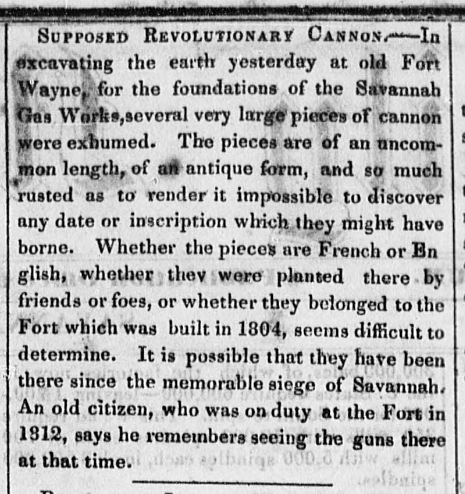 A decade later, by January of 1850, the Savannah Gas Light Company was created and, following brief negotiations with the Federal government officially purchased the property. In March leveling of the remaining slopes began. The March 15 Morning News remarked that workers were “excavating the earth yesterday at old Fort Wayne, for the foundations of the Savannah Gas Works.” It was during the excavations that they uncovered a surprise. As the March 15 Republican noted: “Three large iron guns, stated to be 32 pounders, were disentered at the old Fort yesterday, while excavating for the foundations of the gas works.” Thus marked the origin of the old orphaned cannons which would eventually find their way atop the walls of the Gas Works.